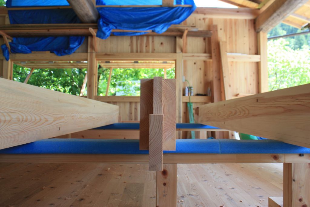 差鴨居のほとんどが主要な柱に差さってくる為、長ほぞ・車知栓・込み栓・鼻栓の仕口にて組みます。鴨居溝などの細かい加工は後程、行います(^ ^)