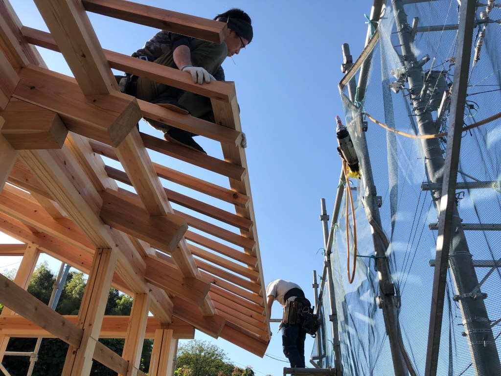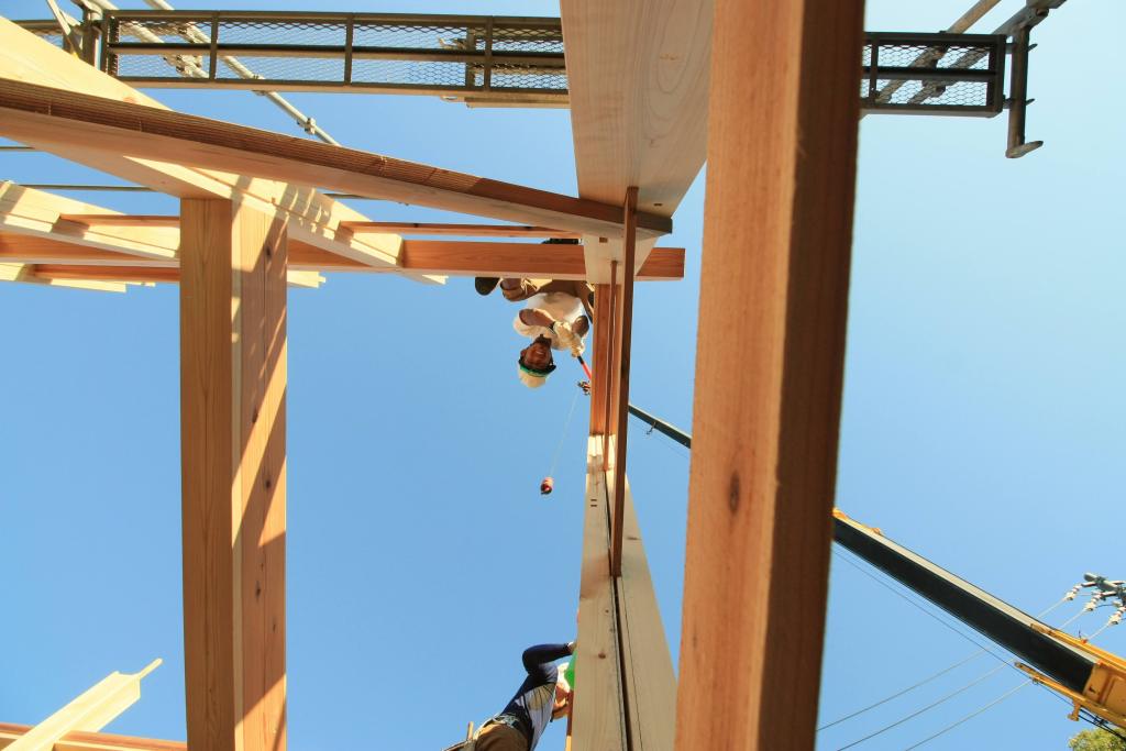 材木を横に寝かせた状態で組み合わせていく『地組み』をして、フレーム状にしていきます。そのフレームをレッカーで吊りながら、起こしていき自立する様に部材をはめ込みます。