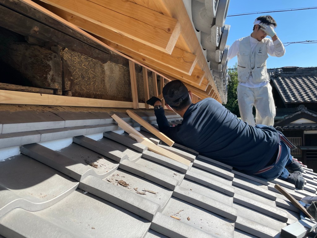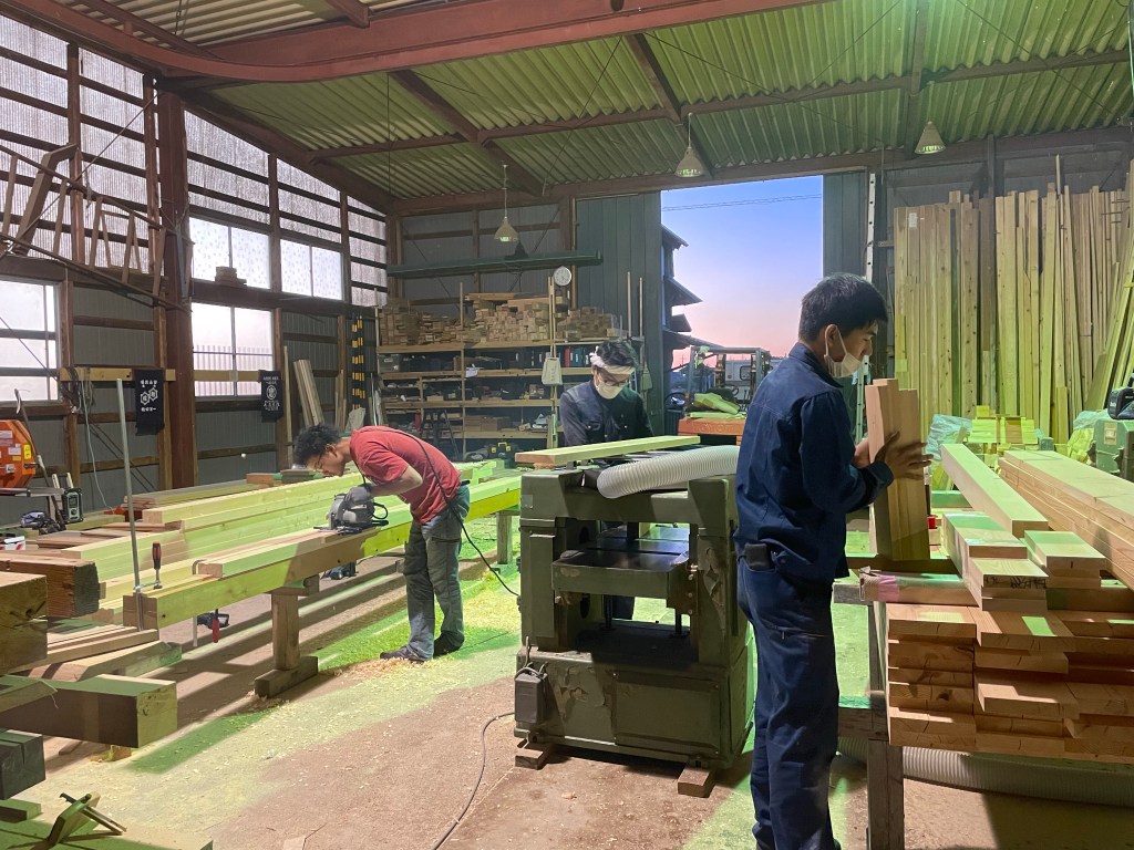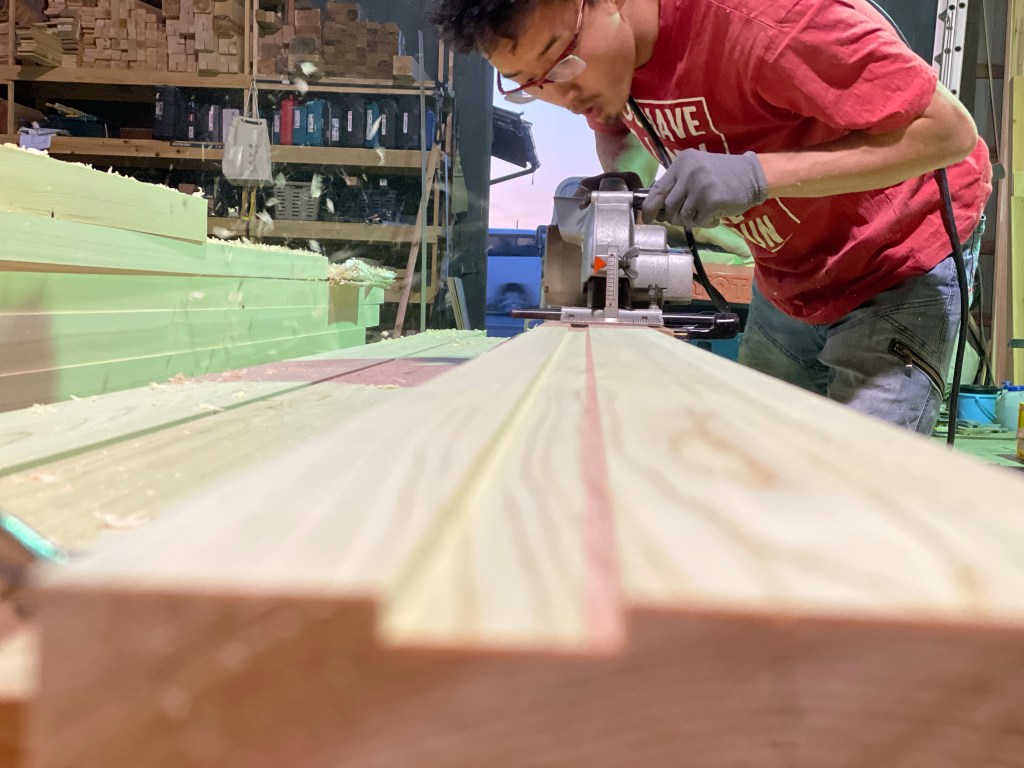 一つ一つ手作りの為、細かい手作業が続きます、この時は関西の大学から、インターンで来ていた方も居たので、大工に混ざって仕事に参加していました。